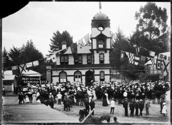 Keywords: blackandwhite monochrome outdoor black and white View of the opening ceremony of the Cambridge Post Office, on 15 Feb 1908. It was opened by Sir Joseph Ward, with a space for a chiming clock which was installed towards the end of that year. Flags are draped either side of the post office, with a large crowd standing in front. Photographed by William Archer Price. Inscriptions: Inscribed - Photographer's title on negative -bottom left: Post Office. Cambridge. 1228. Quantity: 1 b&w original negative(s). Physical Description: Dry plate glass negative 4.5 x 6.5 inches Post Office at Cambridge, 1908. Price, William Archer, 1866-1948 :Collection of post card negatives. Ref: 1/2-001386-G. Alexander Turnbull Library, Wellington, New Zealand. natlib.govt.nz/records/23096532 View of the opening ceremony of the Cambridge Post Office, on 15 Feb 1908. It was opened by Sir Joseph Ward, with a space for a chiming clock which was installed towards the end of that year. Flags are draped either side of the post office, with a large crowd standing in front. Photographed by William Archer Price. Inscriptions: Inscribed - Photographer's title on negative -bottom left: Post Office. Cambridge. 1228. Quantity: 1 b&w original negative(s). Physical Description: Dry plate glass negative 4.5 x 6.5 inches Post Office at Cambridge, 1908. Price, William Archer, 1866-1948 :Collection of post card negatives. Ref: 1/2-001386-G. Alexander Turnbull Library, Wellington, New Zealand. natlib.govt.nz/records/23096532 |
