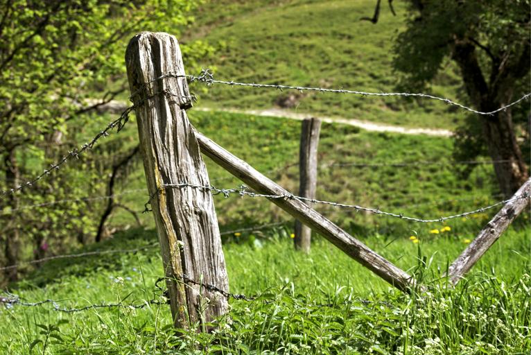 Keywords: post pasture fence fence demarcation old wire pile pasture cattle fence wooden posts wiring barrier security barbed wire fence barbed wire