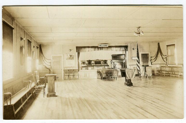 Keywords: postcards halls interiors buildings indoor A real-photo postcard showing the interior of what appears to be a meeting hall. Likely the inside of the Megunticook Grange Hall. A small stage with a piano and four chairs is at the back of the room. A sign reading "Welcome" is over the stage. Wooden benches line the walls on either side of the room. An American flag is to one side of the stage. A roll-top desk is in one corner. Three podiums are set up around the room with banners draped over them. The one nearest the stage bears the letters "F C P." The podium in the middle of the room has a book on it. A real-photo postcard showing the interior of what appears to be a meeting hall. Likely the inside of the Megunticook Grange Hall. A small stage with a piano and four chairs is at the back of the room. A sign reading "Welcome" is over the stage. Wooden benches line the walls on either side of the room. An American flag is to one side of the stage. A roll-top desk is in one corner. Three podiums are set up around the room with banners draped over them. The one nearest the stage bears the letters "F C P." The podium in the middle of the room has a book on it. |