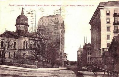 Keywords: outdoor architecture "Court House, Dominion Trust Bldg., Carter-Cotton Bldg. Vancouver, B. C." Private Post Card. No. 10. Printed in Germany. View looking north down Cambie Street from the intersection at West Pender Street in Vancouver, BC. The old Courthouse, viewed at the NW corner of Cambie and Pender Streets. Built in 1888 (wing with dome completed in 1890), it was the first major public building outside the old Gastown area. Demolished in 1912 when the new Courthouse opened at Georgia and Hornby Sts., the site was used for recruiting during the Great War years. After the war, a Cenotaph was erected and the park officially dedicated as Victory Square (1924). "Court House, Dominion Trust Bldg., Carter-Cotton Bldg. Vancouver, B. C." Private Post Card. No. 10. Printed in Germany. View looking north down Cambie Street from the intersection at West Pender Street in Vancouver, BC. The old Courthouse, viewed at the NW corner of Cambie and Pender Streets. Built in 1888 (wing with dome completed in 1890), it was the first major public building outside the old Gastown area. Demolished in 1912 when the new Courthouse opened at Georgia and Hornby Sts., the site was used for recruiting during the Great War years. After the war, a Cenotaph was erected and the park officially dedicated as Victory Square (1924). |