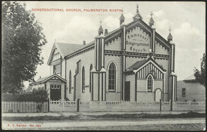 Keywords: outdoor photo border Shows a photograph of the Emmanuel Congregational Church, a wooden building behind a picket fence. Inscriptions: Inscribed - Verso - centre: [Letter to Mr W F Eggers].. Quantity: 1 colour photo-mechanical print(s) on postcard.. Physical Description: Photolithograph, black and white with red lettering, 89 x 139 mm. [Postcard]. Congregational Church, Palmerston North. New Zealand Post-card (carte postale) F T Series no. 882 [1906].. [Postcard album of cards collected by Joye Eggers / Taylor. 1905-1970s].. Ref: Eph-B-POSTCARD-Vol-6-094-1. Alexander Turnbull Library, Wellington, New Zealand. natlib.govt.nz/records/23236617 Shows a photograph of the Emmanuel Congregational Church, a wooden building behind a picket fence. Inscriptions: Inscribed - Verso - centre: [Letter to Mr W F Eggers].. Quantity: 1 colour photo-mechanical print(s) on postcard.. Physical Description: Photolithograph, black and white with red lettering, 89 x 139 mm. [Postcard]. Congregational Church, Palmerston North. New Zealand Post-card (carte postale) F T Series no. 882 [1906].. [Postcard album of cards collected by Joye Eggers / Taylor. 1905-1970s].. Ref: Eph-B-POSTCARD-Vol-6-094-1. Alexander Turnbull Library, Wellington, New Zealand. natlib.govt.nz/records/23236617 |