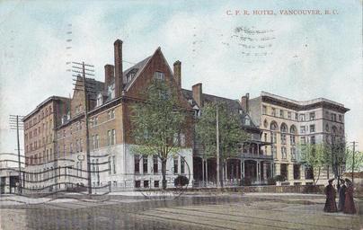 Keywords: outdoor architecture building "C. P. R. Hotel, Vancouver, B. C." Published by W. G. MacFarlane, Toronto and Buffalo. Printed in Germany. View of the original CPR Hotel Vancouver, with additions, on the SW corner of West Georgia and Granville Streets in Vancouver, BC, circa-1908. The corner, "simplified chateau style" structure was the original hotel, built 1886-87 (Thomas Sorby, architect). The addition to the south, along Granville Street (left), was built in 1893-94. The western addition, in an Italian Renaissance palazzo style (right), was built 1901-05 (Francis M. Rattenbury, architect). Most of the buildings were replaced by the second CPR Hotel Vancouver structure (built 1913-16). Only Rattenbury's west-side corner structure (at Georgia and Howe Sts.) was incorporated into the new project. "C. P. R. Hotel, Vancouver, B. C." Published by W. G. MacFarlane, Toronto and Buffalo. Printed in Germany. View of the original CPR Hotel Vancouver, with additions, on the SW corner of West Georgia and Granville Streets in Vancouver, BC, circa-1908. The corner, "simplified chateau style" structure was the original hotel, built 1886-87 (Thomas Sorby, architect). The addition to the south, along Granville Street (left), was built in 1893-94. The western addition, in an Italian Renaissance palazzo style (right), was built 1901-05 (Francis M. Rattenbury, architect). Most of the buildings were replaced by the second CPR Hotel Vancouver structure (built 1913-16). Only Rattenbury's west-side corner structure (at Georgia and Howe Sts.) was incorporated into the new project. |