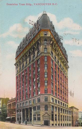 Keywords: photo border outdoor drawing "Dominion Trust Bldg., Vancouver, B. C." Private Post Card. European Import Co., Chromo-Serie No. 65. Made in Germany. Dominion Building, 207 West Hastings Street (NW corner at Cambie Street) in Vancouver, BC. Built 1908-10. Architects: J.S. Helyer and Son. The Imperial Trust Company promoted this 13-storey office tower as 'an object of pride to every citizen…advertising our city as the most prosperous go ahead commercial city on the continent.' When completed as the home of Dominion Trust Company, with whom Imperial Trust had merged, it was described as the most modern office building in Canada, the highest steel structure on the West Coast, and the tallest building in the British Empire. In 1914, shortly after having sold the building to the Dominion (now Toronto Dominion) Bank, Dominion Trust collapsed. The red brick and yellow terra cotta veneer is capped by a slightly too-attenuated beaux-arts roof. [From: Exploring Vancouver by Harold Kalman (University of British Columbia Press, 1974)] "Dominion Trust Bldg., Vancouver, B. C." Private Post Card. European Import Co., Chromo-Serie No. 65. Made in Germany. Dominion Building, 207 West Hastings Street (NW corner at Cambie Street) in Vancouver, BC. Built 1908-10. Architects: J.S. Helyer and Son. The Imperial Trust Company promoted this 13-storey office tower as 'an object of pride to every citizen…advertising our city as the most prosperous go ahead commercial city on the continent.' When completed as the home of Dominion Trust Company, with whom Imperial Trust had merged, it was described as the most modern office building in Canada, the highest steel structure on the West Coast, and the tallest building in the British Empire. In 1914, shortly after having sold the building to the Dominion (now Toronto Dominion) Bank, Dominion Trust collapsed. The red brick and yellow terra cotta veneer is capped by a slightly too-attenuated beaux-arts roof. [From: Exploring Vancouver by Harold Kalman (University of British Columbia Press, 1974)] |