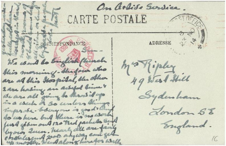 | Keywords: postcard le havre lehavre sainte addresse sainteaddresse nurse hospital ripley public domain publicdomain ww1 nurse ripley nurseripley text writing document drawing sketch I am uploading these postcards chronologically. I believe this was sent not more than a few days after Margaret, a nurse, had arrived in France. The front depicts Sainte Adresse, France, which must have been where she was based as she mentions walking along here. It is less than a kilometer north of the center of Le Havre. From what I can read (corrections welcome), she writes: "Sun[day]. We went to English Church this morning - the four who are at this hospital , the other 2 are having an awful time & we are all going to throw[?] it up in a week or so unless things improve. Everyone is good & kind to us here but there is no work just given out 120 Red packets sent by our [???]. Nearly all are fairly convalescent now anyway can get up mostly. Went along here for walk yesterday awe[?]-fully cold here except in wards mostly rooms of 8 beds some larger all given or lent by Havre[?] people. Love Mar" I am uploading these postcards chronologically. I believe this was sent not more than a few days after Margaret, a nurse, had arrived in France. The front depicts Sainte Adresse, France, which must have been where she was based as she mentions walking along here. It is less than a kilometer north of the center of Le Havre. From what I can read (corrections welcome), she writes: "Sun[day]. We went to English Church this morning - the four who are at this hospital , the other 2 are having an awful time & we are all going to throw[?] it up in a week or so unless things improve. Everyone is good & kind to us here but there is no work just given out 120 Red packets sent by our [???]. Nearly all are fairly convalescent now anyway can get up mostly. Went along here for walk yesterday awe[?]-fully cold here except in wards mostly rooms of 8 beds some larger all given or lent by Havre[?] people. Love Mar" |