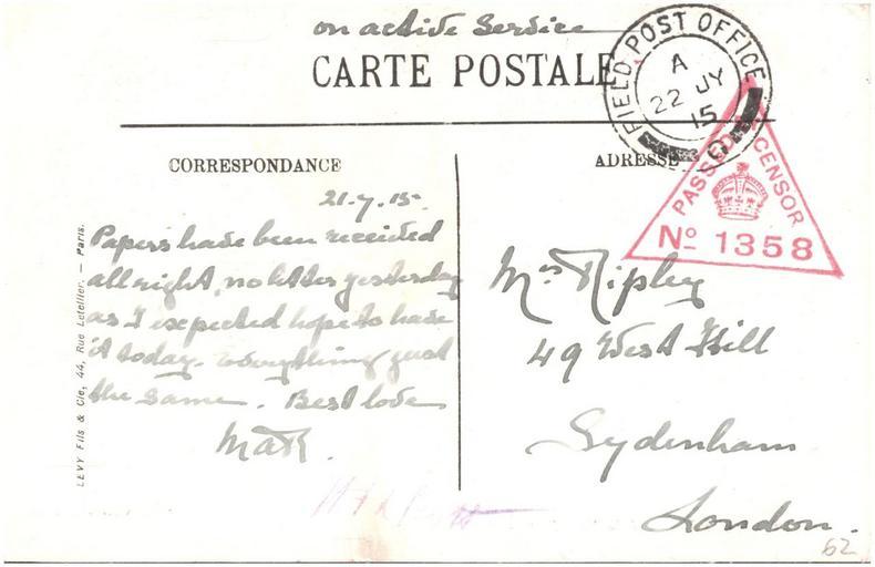 | Keywords: france war world war 1 worldwar1 ww1 postcard ripley public domain publicdomain nurse ripley nurseripley text writing drawing sketch Sent by a nurse, Margaret Ripley, to her mother back in England. Interesting that this card is the first for over a month. Did she not send any, or are they simply missing from this album? Given teh brevity and tone of the message I highly doubt this was the first time she had written for a long while. As far as I can tell (corrections and additions welcome) this reads: "21.7.15 Papers have been received all right. No letter yesterday as I expected hope to have it today. Everything just the same. Best love Mar" For more details of the story behind this album see www.flickr.com/photos/whatsthatpicture/sets/7215762769463... Sent by a nurse, Margaret Ripley, to her mother back in England. Interesting that this card is the first for over a month. Did she not send any, or are they simply missing from this album? Given teh brevity and tone of the message I highly doubt this was the first time she had written for a long while. As far as I can tell (corrections and additions welcome) this reads: "21.7.15 Papers have been received all right. No letter yesterday as I expected hope to have it today. Everything just the same. Best love Mar" For more details of the story behind this album see www.flickr.com/photos/whatsthatpicture/sets/7215762769463... |