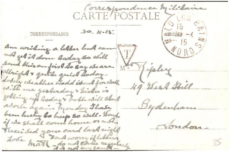 | Keywords: postcard france ww1 world war 1 worldwar1 public domain publicdomain nurse ripley nurseripley text document writing monochrome Sent by a nurse, Margaret Ripley, to her mother back in England. As far as I can tell (corrections and additions welcome) this reads: "30.4.15 Am writing a letter but can not get it done today so will send this on first to say we are all right & quite quiet today. Lovely weather. Todd went for walk with me yesterday & Sister is getting up today & both will start work again Monday I have been lucky to keep so well. Wonder if we shall come home or not. Received your card last night Love Mar Don't worry if letters do not come regularly it is not my fault." For more details of the story behind this album see www.flickr.com/photos/whatsthatpicture/sets/7215762769463... Sent by a nurse, Margaret Ripley, to her mother back in England. As far as I can tell (corrections and additions welcome) this reads: "30.4.15 Am writing a letter but can not get it done today so will send this on first to say we are all right & quite quiet today. Lovely weather. Todd went for walk with me yesterday & Sister is getting up today & both will start work again Monday I have been lucky to keep so well. Wonder if we shall come home or not. Received your card last night Love Mar Don't worry if letters do not come regularly it is not my fault." For more details of the story behind this album see www.flickr.com/photos/whatsthatpicture/sets/7215762769463... |
