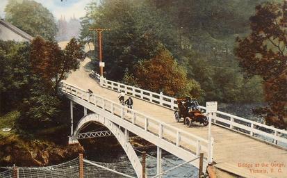 | Keywords: outdoor "Bridge at the Gorge, Victoria, B. C." Post Card. Made Expressly for Canadian Pacific Railway News Service. Tillicum Road bridge over the Gorge Waterway and rapids. Bridge joins Municipality of Saanich and Victoria with Esquimalt on Vancouver Island, BC. In the distance is Esquimalt, the dance pavilion and the Tramway Gorge Park loop (today's Esquimalt Gorge Park). The bridge illustrated above was the fifth bridge structure to span this crossing. It opened officially on July 6, 1899 and featured white woodwork supported by two substantial steel arches lined with electric lights. Used to the point of deterioration, the bridge's safety began to become a concern beginning in 1915. It was finally demolished in 1933 and replaced with a new, lighter-framed steel structure. (The current, seventh Gorge Bridge of reinforced concrete dates to 1967.) "Bridge at the Gorge, Victoria, B. C." Post Card. Made Expressly for Canadian Pacific Railway News Service. Tillicum Road bridge over the Gorge Waterway and rapids. Bridge joins Municipality of Saanich and Victoria with Esquimalt on Vancouver Island, BC. In the distance is Esquimalt, the dance pavilion and the Tramway Gorge Park loop (today's Esquimalt Gorge Park). The bridge illustrated above was the fifth bridge structure to span this crossing. It opened officially on July 6, 1899 and featured white woodwork supported by two substantial steel arches lined with electric lights. Used to the point of deterioration, the bridge's safety began to become a concern beginning in 1915. It was finally demolished in 1933 and replaced with a new, lighter-framed steel structure. (The current, seventh Gorge Bridge of reinforced concrete dates to 1967.) |
