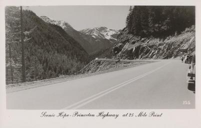 Keywords: photo border outdoor monochrome "Scenic Hope-Princeton Highway at 25 Mile Point" Post Card by J. C. Walker, Vancouver, B.C. Hope-Princeton Highway (Hwy. 3) at 25-Mile Point. 1950 photo. The Hope-Princeton Highway opened on November 2, 1949 and is part of the Southern Trans-Provincial Highway (Hwy. 3, a.k.a. the Crowsnest Highway) in British Columbia. "Scenic Hope-Princeton Highway at 25 Mile Point" Post Card by J. C. Walker, Vancouver, B.C. Hope-Princeton Highway (Hwy. 3) at 25-Mile Point. 1950 photo. The Hope-Princeton Highway opened on November 2, 1949 and is part of the Southern Trans-Provincial Highway (Hwy. 3, a.k.a. the Crowsnest Highway) in British Columbia. |