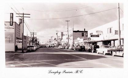 Keywords: photo border "Langley Prairie, B. C." Post Card. Made in Canada. View looking west down the Fraser Highway (then, the Trans-Canada Highway; Hwy. 1) into the 20500- and 20400-block from Park Avenue (now McBurney Lane) in Langley Prairie, the centre of Langley, BC. Langley Prairie incorporated as the City of Langley in March 1955, separating it from the Township of Langley. "Langley Prairie, B. C." Post Card. Made in Canada. View looking west down the Fraser Highway (then, the Trans-Canada Highway; Hwy. 1) into the 20500- and 20400-block from Park Avenue (now McBurney Lane) in Langley Prairie, the centre of Langley, BC. Langley Prairie incorporated as the City of Langley in March 1955, separating it from the Township of Langley. |