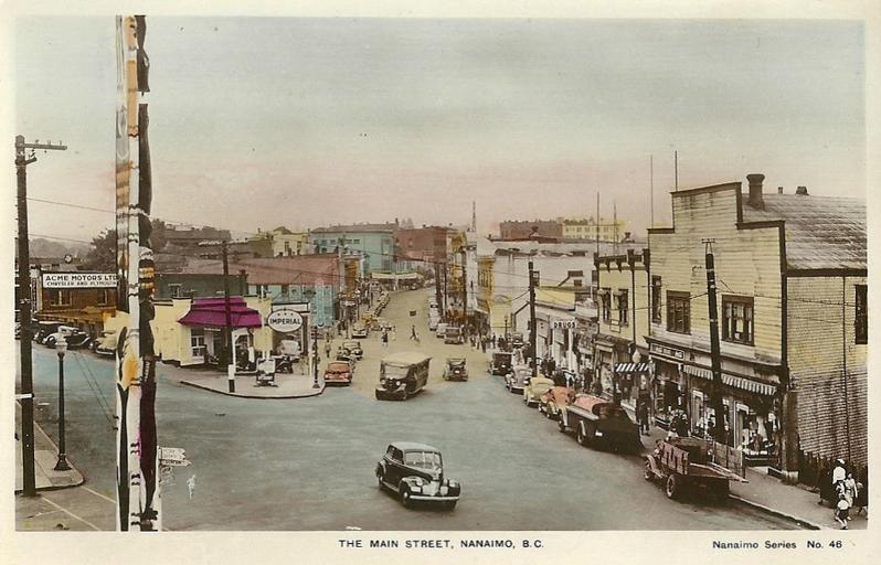 Keywords: photo border "The Main Street, Nanaimo, B.C. Nanaino Series No. 46" Post Card. This is a Real Photograph. Hand Coloured. Copyright, J. Fred Spalding. Published by The Camera Products Co., 1731, Dunbar Street, Vancouver, B.C. Made in England. View looking north up Commercial Street into the 000-block from the intersection at Victoria Crescent and Wallace Street (left) in Nanaimo, BC on Vancouver Island. "The Main Street, Nanaimo, B.C. Nanaino Series No. 46" Post Card. This is a Real Photograph. Hand Coloured. Copyright, J. Fred Spalding. Published by The Camera Products Co., 1731, Dunbar Street, Vancouver, B.C. Made in England. View looking north up Commercial Street into the 000-block from the intersection at Victoria Crescent and Wallace Street (left) in Nanaimo, BC on Vancouver Island. |