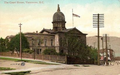 | Keywords: outdoor "The Court House, Vancouver, B.C." Souvenir Post Card. Published by E. P. Charlton & Co., Ltd., Vancouver, B.C. Printed in Great Britain. The old Courthouse, viewed at the NW corner of Cambie and Pender Streets. Built in 1888 (wing with dome completed in 1890), it was the first major public building outside the old Gastown area. Demolished in 1912 when the new Courthouse opened at Georgia and Hornby Sts., the site was used for recruiting during the Great War years. After the war, a Cenotaph was erected and the park officially dedicated as Victory Square (1924). The flag in the photograph is flying at half-mast in honour to San Francisco after news of their disastrous earthquake and fire of April 18, 1906. "The Court House, Vancouver, B.C." Souvenir Post Card. Published by E. P. Charlton & Co., Ltd., Vancouver, B.C. Printed in Great Britain. The old Courthouse, viewed at the NW corner of Cambie and Pender Streets. Built in 1888 (wing with dome completed in 1890), it was the first major public building outside the old Gastown area. Demolished in 1912 when the new Courthouse opened at Georgia and Hornby Sts., the site was used for recruiting during the Great War years. After the war, a Cenotaph was erected and the park officially dedicated as Victory Square (1924). The flag in the photograph is flying at half-mast in honour to San Francisco after news of their disastrous earthquake and fire of April 18, 1906. |