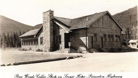 Keywords: architecture outdoor building monochrome "Pine Woods Coffee Shop on Scenic Hope-Princeton Highway" Pine Woods Lodge on Hope-Princeton Highway, Manning Park, British Columbia, Canada. "Pinewoods Lodge Ltd.: This large rustic lodge in the heart of the park has restaurant and dining room facilities. See the wood carvings in the lounge. Twelve first class motel units and a number of cheaper "family" cabins are operated in conjunction with it. There also is an Esso service station. Horses are kept for hire and, in winter, a ski tow and skating rink cater to holidayers." [From: Milestones in Ogopogo Land by C.P. Lyons (Evergreen Press, 1957)] "Pine Woods Coffee Shop on Scenic Hope-Princeton Highway" Pine Woods Lodge on Hope-Princeton Highway, Manning Park, British Columbia, Canada. "Pinewoods Lodge Ltd.: This large rustic lodge in the heart of the park has restaurant and dining room facilities. See the wood carvings in the lounge. Twelve first class motel units and a number of cheaper "family" cabins are operated in conjunction with it. There also is an Esso service station. Horses are kept for hire and, in winter, a ski tow and skating rink cater to holidayers." [From: Milestones in Ogopogo Land by C.P. Lyons (Evergreen Press, 1957)] |