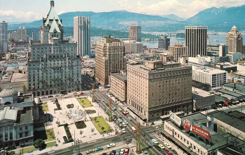 | Keywords: city architecture outdoor skyline road building structure infrastructure building skyscraper building complex "V-49 Vancouver, B.C., Canada Birdseye View of Georgia Street Hotels — Vancouver - Georgia and Devonshire face the Courthouse Centennial Fountain grounds. In the distance is Stanley Park and Burrard Inlet, with North Shore Mountains in the background." Photo by George Weinhaupl. S-2810 Pub. by Natural Color Productions, Ltd., Vancouver, B.C. The intersection at the bottom is West Georgia and Howe Streets. "V-49 Vancouver, B.C., Canada Birdseye View of Georgia Street Hotels — Vancouver - Georgia and Devonshire face the Courthouse Centennial Fountain grounds. In the distance is Stanley Park and Burrard Inlet, with North Shore Mountains in the background." Photo by George Weinhaupl. S-2810 Pub. by Natural Color Productions, Ltd., Vancouver, B.C. The intersection at the bottom is West Georgia and Howe Streets. |