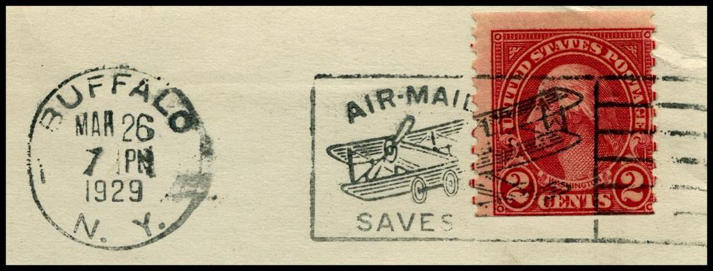Keywords: Postmark US airmail saves time.jpg en US postmark from 1929 with pictorial slogan cancellation AIRMAIL SAVES TIME ; U S stamp 1929 2 cents Washington carmine coil Scott 599A 1929 scanned September 2005 by User Stan Shebs PD-USGov United States Air Mail 1929 stamps Stamps of the United States 1921-1930 Coil stamps Buffalo New York Postmarks of New York Red stamps 1929 postmarks |