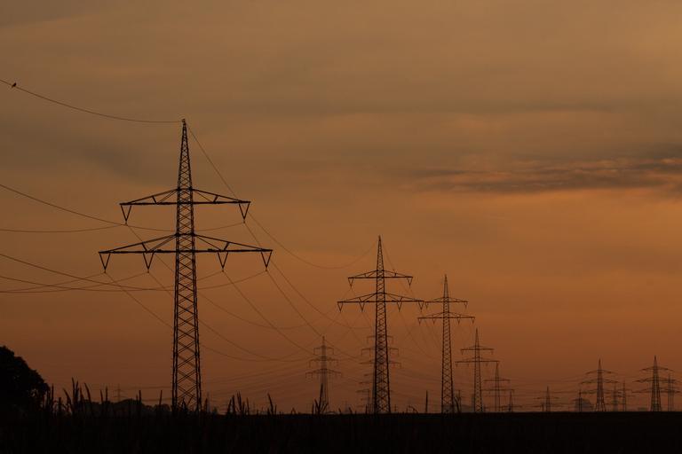 Keywords: power lines pylons power poles current cable power line power supply sunset sky landscape nature light mast bird orange