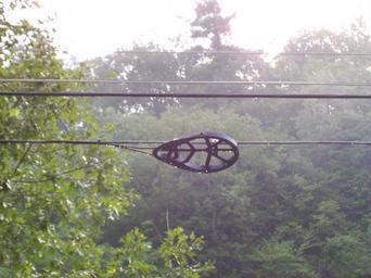 | Keywords: Power racket1.jpg optical fiber cable runs on poles to facilitate maintenance Splicing optical fiber is a precision operation that can't be done on the pole itself only on the ground Therefore the installation crew leaves several hundred spare feet of fiber in cable runs next to junction boxes enough so the junction box can be removed from the pole and brought to ground level for servicing The extra cable is wound in several hairpin loops on a pair of reels like this separated by 50 feet or so Optical fiber lines like this are usually used to distribute cable television signals or less often to carry internet lines or telephone trunklines own myself 2009-08-01 Electricity Power lines in the United States |