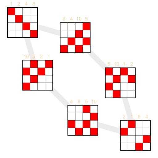 Keywords: Powers of wp( 8, 4,10, 5).svg Cycle graph of compression matrices of 4-bit Walsh permutations related to 4-ary bent functions own 2012 User Lipedia 4-bit Walsh permutations related to bent functions; powers in C6 cycle graphs