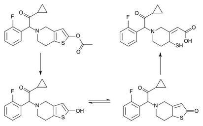 Keywords: Prasugrel activation.svg prasugrel top left to its active metabolite top right The first and last steps are hydrolyses while the two structures at the bottom are tautomer s of each other own Anypodetos 2011-12-24 File Prasugrel active metabolite svg only the active metabolite BKchem 001 -check Prasugrel Metabolism Cc-zero |
