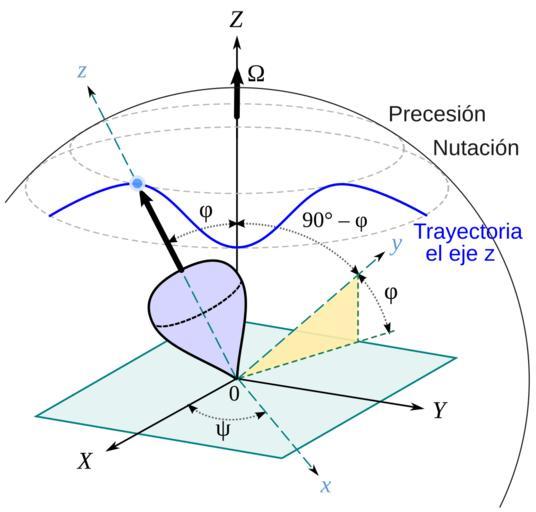 Keywords: Precession-nutation-xyz-ES.svg en Precession is a change in the orientation of the rotation axis of a rotating body es La precesión es el movimiento asociado con el cambio de dirección en el espacio que experimenta el eje instantáneo de rotación de un cuerpo own 11/06/2010 Caliver Ex profeso para Wikipedia -the free encyclopedia- Astronomical diagrams |