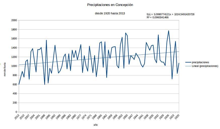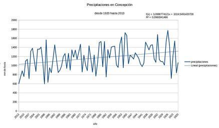 Keywords: Precipitaciones en Concepción 2013-1920.png es Precipitaciones en Concepción Biobio Chile Se muestra un claro descenso en la intensidad de las precipitaciones como así lo confirma la línea de tendencia con sus respectivas ecuaciones al extremo superior derecho ; así como también las respectivas variaciones de los fenómenos del Niño y la Niña Eje x años Eje y milímetros de lluvia caídos Datos tomados desde los informes meteorológicos anuales de la Dirección Meteorológica de Chile; se toman en cuenta los datos de Carriel Sur desde su inauguración salvo en 1979 con un dato estimado faltaba el mes de diciembre 1964 noviembre 1958 diciembre ; y con los datos de hualpencillo en 1967 1963; de la Universidad de Concepción entre 1961 y 1959; de Punta Hualpén en 1941 http //164 77 222 61/climatologia/php/menuAnuarios php en Rainfall in Concepción Biobio Chile It shows a clear decline in the intensity of rainfall as well as confirms the trend line with their respective equations to top right ; as well as the respective variations of the phenomena of the Child X-axis years y-axis millimeters of rain fallen Data taken from the annual weather reports Meteorological Direction of Chile; Carriel Sur data are taken into account since its inauguration in 1979 saved an estimated data missing the month of December 1964 November 1958 December ; and data Hualpencillo 1967 1963; University of Conception between 1961 and 1959; Punta Hualpén in 1941 de Niederschlagsmenge in Concepción Biobio Chile Es zeigt einen deutlichen Rückgang in der Intensität der Niederschläge sowie bestätigt die Trendlinie mit ihren jeweiligen Gleichungen nach rechts oben ; sowie den jeweiligen Veränderungen der Phänomene des Kindes X-Achse Jahre y-Achse Millimeter regen gefallen Daten aus der jährlichen Wetter genommen berichtet Meteorological Richtung Chile; Carriel Sur Daten berücksichtigt werden seit seiner Eröffnung im Jahr 1979 gerettet geschätzte Daten fehlende Monat Dezember 1964 November 1958 Dezember ; und Daten Hualpencillo 1967 1963; University of Conception zwischen 1961 und 1959; Punta Hualpén 1941 pt Chuvas em Concepción Biobio Chile Ele mostra um claro declínio na intensidade das chuvas bem como confirma a linha de tendência com suas respectivas equações para o topo direito ; bem como as respectivas variações dos fenômenos da Criança X-eixo anos eixo y milímetros de chuva caíram Dados extraídos do tempo relatórios anuais Direção Meteorológica do Chile; Dados Carriel Sur são tidos em conta desde a sua inauguração em 1979 salvo um conjunto de dados estimados faltando o mês de dezembro 1964 novembro de 1958 dezembro ; e dados Hualpencillo 1967 1963; Universidade da Conceição entre 1961 e 1959; Punta Hualpén em 1941 2015-05-07 own Tadeoska other versions cc-zero Uploaded with UploadWizard Climatografía Clima Clima en el Biobio Chile Biobio Precipitaciones Clima en Suramérica |