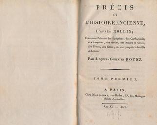 Keywords: Precis-1803.jpg de Précis de l'historire ancienne d'après rollin Jacques-Corentin Royou Tome premier Paris 1803 aus der Slg von Peter Schmelzle Bad Wimpfen 1803 book n n 1803 pd-100 1803 books PD-old-100