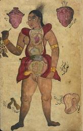 | Keywords: Pregnant woman made by Muḥammad Arzānī.jpg anatomy of pregnant woman made by Muḥammad Arzānī d 1722/ 1134 ink and opaque watercolors of a pregnant woman with abdomen and chest opened to reveal the internal organs and fetus Surrounding the figure are drawings of at the top two hearts lower right the lungs India http //www nlm nih gov/hmd/arabic/images/p20554b jpg Permission PD-Art Diagrams of the human anatomy Pregnant women in art | ||||