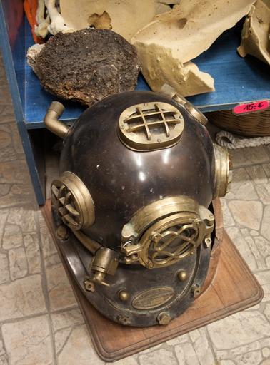 Keywords: Presentation and sail of sponges in Symi - old diver's helmet.jpg Presentation and sail of sponges in Symi own 2013-09-23 Szilas Commonist Standard diving helmets Shops in Symi 2013 in Symi 0923 September 2013 in Greece 23