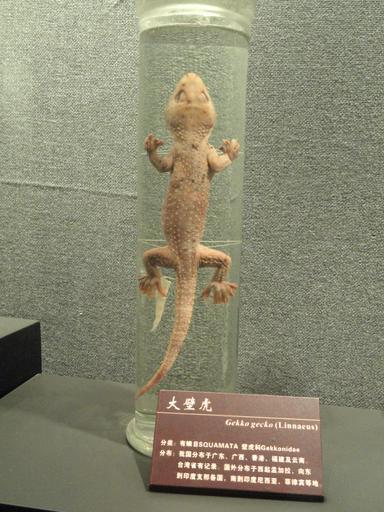 Keywords: Preserved specimens - Kunming Natural History Museum of Zoology - DSC02408.JPG Preserved specimens in the Kunming Natural History Museum of Zoology 昆明动物博物馆 Kunming Yunnan China I took this photograph 2011-08-10 02 39 13 Daderot Public domain Preserved specimens in the Kunming Natural History Museum of Zoology Gekko gecko |