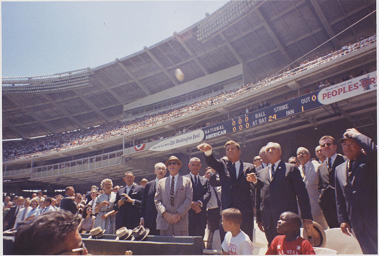 | Keywords: President attends the 32nd All-Star Baseball Game, throws out first ball. Speaker of the House John W. McCormack... - NARA - 194250.jpg Scope and content General notes 194250 Local identifier President 1963-1969 Johnson White House Photograph Office 1963 - 1969 Most Recent <br /> President 1961-1963 Kennedy Office of the Military Aide 01/20/1961 - 11/22/1963 Predecessor Creator Cecil W Stoughton John F Kennedy Library NLJFK Columbia Point Boston MA 02125-3398 1962-07-10 Record group Collection JFK-WHP White House Photographs 12/19/1960 - 03/11/1964 Record group ARC 1177 Cecil Stoughton's White House Photographs compiled 01/29/1961 - 12/31/1963 Series ARC 194234 File unit File unit ARC Variant control numbers NAIL Control Number NLK-WHP-ST-STC15562 Other versions <gallery> File President_attends_the_32nd_All-Star_Baseball_Game _throws_out_first_ball _Speaker_of_the_House_John_W _McCormack _-_NARA_-_194250 tif tif File President_attends_the_32nd_All-Star_Baseball_Game _throws_out_first_ball _Speaker_of_the_House_John_W _McCormack _-_NARA_-_194250 jpg jpg </gallery> NARA-cooperation PD-USGov John F Kennedy in 1962 John William McCormack Lyndon B Johnson in 1962 0710 Ford Frick Dave Powers Major League Baseball All-Star Game 1962 in Washington D C ImageNote 1 1755 1092 173 203 3000 2026 2 John F Kennedy ImageNoteEnd 1 ImageNote 2 1474 1231 135 169 3000 2026 2 Lyndon B Johnson ImageNoteEnd 2 ImageNote 3 1204 1272 128 150 3000 2026 2 John William McCormack ImageNoteEnd 3 ImageNote 4 1331 1276 98 116 3000 2026 2 David Powers Special Assistant to the President ImageNoteEnd 4 1962 in Major League Baseball Ceremonial first pitch Major League Baseball Photographs by Cecil W Stoughton Ceremonial first pitch |