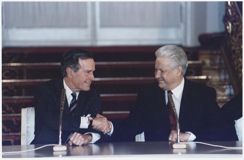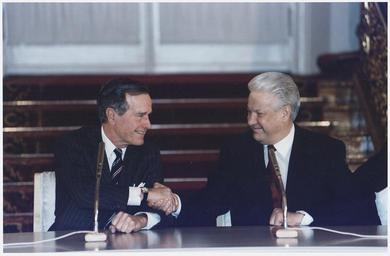 Keywords: President Bush and Russian President Boris Yeltsin sign the Start II Treaty at a Ceremony in Vladimir Hall, The... - NARA - 186462.tif Scope and content General notes 186462 Local identifier President 1989-1993 Bush Photograph Office 1989 - 1993 NARA-Author Biddle Susan 1940- Photographer 8464488 <br /> George Bush Library NLGB 1000 George Bush Drive West College Station TX 77845 1993-01-03 Record group Collection GB-WHPO Records of the White House Photograph Office 01/20/1989 - 01/20/1993 Record group ARC 1082 George H W Bush Presidential Photographs compiled 01/20/1989 - 01/20/1993 Series ARC 186364 File unit File unit ARC Variant control numbers NAIL Control Number NLB-WHPC-A-P38839 24 yes Other versions NARA-cooperation PD-USGov George H W Bush in 1993 George H W Bush shaking hands Presidents of Russia signing documents Presidents of the United States signing documents Boris Yeltsin 1993 events in Moscow |