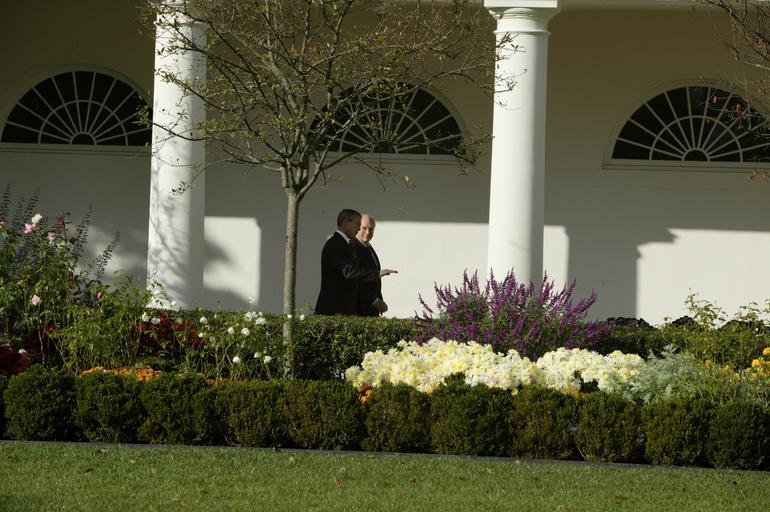View Original:President_Bush_and_Vice_President_Cheney_Walk_Along_the_White_House_Colonnade.jpg (4064x2704)