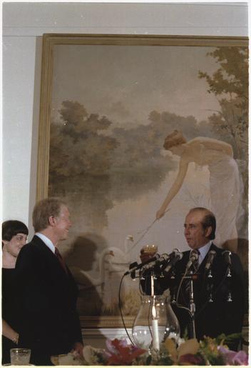 | Keywords: President Carlos Perez toasts Jimmy Carter during a state visit to Venezuela. - NARA - 178543.tif Scope and content General notes 178543 Local identifier President 1977-1981 Carter White House Staff Photographers 01/20/1977 - 01/20/1981 Jimmy Carter Library NLJC 441 Freedom Parkway Atlanta GA 30307-1498 1978-03-28 Record group Collection JC-WHSP Carter White House Photographs Collection 01/20/1977 - 01/22/1981 Record group ARC 1120 Carter White House Photographs Presidential compiled 01/20/1977 - 01/22/1981 Series ARC 173341 File unit Jimmy Carter Rosalynn Carter - Caracas Venezuela 03/28/1978 - 03/28/1978 File unit ARC 178542 Variant control numbers NAIL Control Number NLC-WHSP-C-04890-28 yes Other versions NARA-cooperation PD-USGov Carlos Andrés Pérez Jimmy Carter with national leaders State visits Relations of the United States and Venezuela |