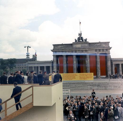 | Keywords: President John F. Kennedy on a platform overlooking the Berlin Wall at the Brandenburg Gate during his visit to West Berlin.jpg KN-C29208 President John F Kennedy on a platform overlooking the Berlin Wall at the Brandenburg Gate during his visit to West Berlin Photograph by Robert Knudsen White House in the John F Kennedy Presidential Library and Museum Boston http //www jfklibrary org/JFK/Media-Gallery/President-and-Mrs-Kennedy-Abroad aspx 1963-06-26 PD-USGov John F Kennedy Presidential Library and Museum |