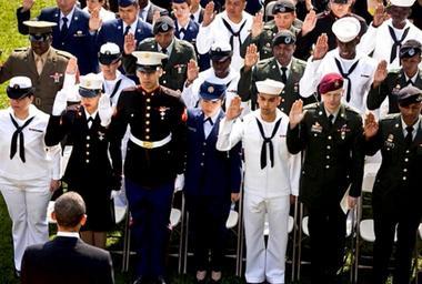 Keywords: President Meets Marine at Naturalization Ceremony DVIDS304712.jpg en Cpl Charlyston Schultz third from left front row a personnel clerk with the Installation Personnel Administration Center Headquarters and Support Battalion Marine Corps Base Camp Lejeune stands just a few feet away from President Barack Obama foreground during a naturalization ceremony for U S service members at the White House Washington recently Schultz a native of Uberlandia Brazil came to the U S in 1998 and became a citizen through serving America in the Marines 2010-07-29 https //www dvidshub net/image/304712 304712 2010-07-29 14 17 CAMP LEJEUNE NC US PD-USGov Barack Obama in 2010 Marine Corps Base Camp Lejeune Images from DoD uploaded by Fæ |