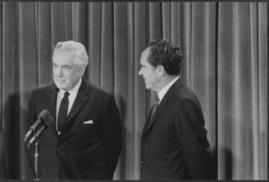 | Keywords: President Nixon looks on as the newly appointed chief justice of the Supreme Court, Warren Burger, says a few remarks - NARA - 194632.tif Scope and content Pictured Chief Justice Warren Burger President Richard Nixon Subject Supreme Court Members General notes 194632 Local identifier NLRN-WHPO-1117-04A General Services Administration National Archives and Records Service Office of Presidential Libraries Office of Presidential Papers 01/20/1969 - ca 12/1974 Most Recent <br /> President 1969-1974 Nixon White House Photo Office 1969 - 1974 Most Recent NARA-Author Atkins Oliver F 1916-1977 Photographer 8451334 <br /> Richard Nixon Library NLRN 18001 Yorba Linda Boulevard Yorba Linda CA 92886 1969-05-21 Record group Collection RN-WHPO White House Photo Office Collection Nixon Administration 01/20/1969 - 08/09/1974 Record group ARC 1179 Nixon White House Photographs compiled 01/20/1969 - 08/09/1974 documenting the period 08/08/1968 - 08/09/1974 Series ARC 194277 File unit File unit ARC Variant control numbers NAIL Control Number NLNP-WHPO-MPF-1117 04A yes Other versions NARA-cooperation PD-USGov Photographs by Ollie Atkins |