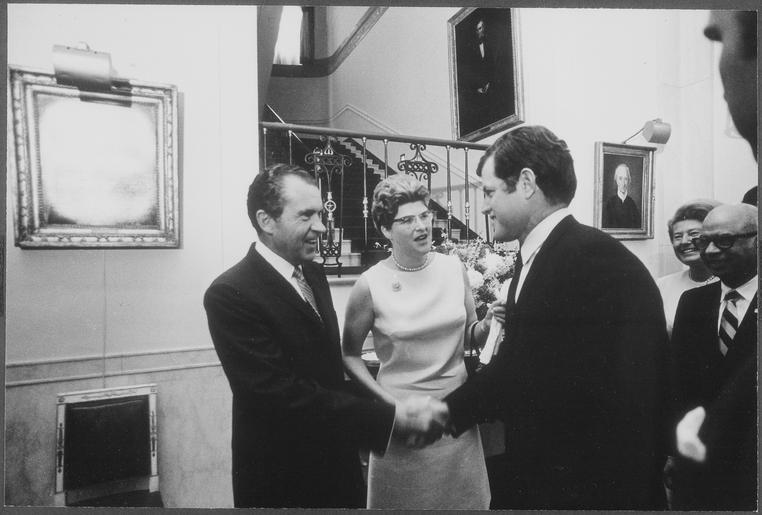 | Keywords: President Nixon with League of Women Voters - NARA - 194624.tif Scope and content Pictured President Nixon Senator Ted Kennedy General notes 194624 Local identifier NLRN-WHPO-0813-26A General Services Administration National Archives and Records Service Office of Presidential Libraries Office of Presidential Papers 01/20/1969 - ca 12/1974 Most Recent <br /> President 1969-1974 Nixon White House Photo Office 1969 - 1974 Most Recent NARA-Author Atkins Oliver F 1916-1977 Photographer 8451334 <br /> Richard Nixon Library NLRN 18001 Yorba Linda Boulevard Yorba Linda CA 92886 1969-04-17 Record group Collection RN-WHPO White House Photo Office Collection Nixon Administration 01/20/1969 - 08/09/1974 Record group ARC 1179 Nixon White House Photographs compiled 01/20/1969 - 08/09/1974 documenting the period 08/08/1968 - 08/09/1974 Series ARC 194277 File unit File unit ARC Variant control numbers NAIL Control Number NLNP-WHPO-MPF-0813 26A yes Other versions NARA-cooperation PD-USGov Photographs by Ollie Atkins Richard Nixon shaking hands Ted Kennedy League of Women Voters |