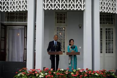 Keywords: President Obama and Aung San Suu Kyi Address the Media - Flickr - East Asia and Pacific Media Hub (5).jpg RANGOON Burma November 14 2014 President Barack Obama with Chairperson of the National League for Democracy and Member of Parliament Aung San Suu Kyi addresses the international media State Department photo by William Ng/Public Domain https //www flickr com/photos/eapmediahub/15601549948/ President Obama and Aung San Suu Kyi Address the Media 2014-11-14 15 30 https //www flickr com/people/56477391 N06 East Asia and Pacific Media Hub U S Department of State PD-USGov East Asia and Pacific Media Hub https //flickr com/photos/56477391 N06/15601549948 2016-11-27 04 12 49 United States Government Work Uncategorized 2016 November 27 Files_from_East_Asia_and_Pacific_Media_Hub_U S _Department_of_State_Flickr_stream Files_uploaded_by_Josve05a_ U S _DoS |