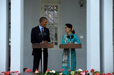 Keywords: President Obama and Daw Aung San Suu Kyi Address Reporters in Rangoon - 15791182182.jpg en President Barack Obama with Chairperson of the National League for Democracy and Member of Parliament Aung San Suu Kyi addresses the international media at her residence in Rangoon Burma on November 14 2014 State Department photo by William Ng/ Public Domain 2014-11-14 15 09 22 http //www flickr com/photos/9364837 N06/15791182182/ U S Department of State other versions 16 797310 96 144104 PD-USGov PD-USGov Relations of Myanmar and the United States Uploaded with UploadWizard |