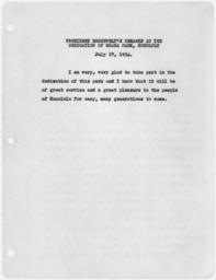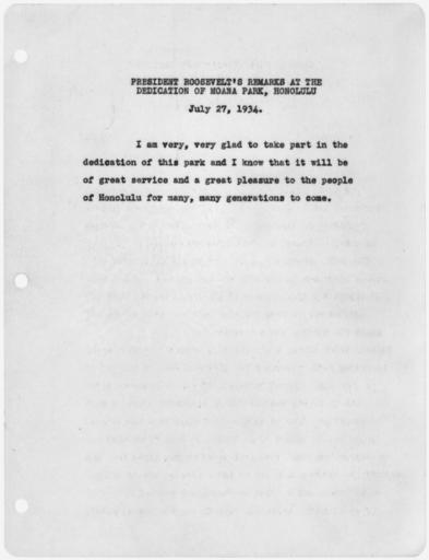 Keywords: President Roosevelt's remarks at the dedication of Moana Park, Honolulu - NARA - 197463.jpg Scope and content General notes 197463 Local identifier President 1933-1945 Roosevelt 1933 - 1945 NARA-Author Roosevelt Franklin D Franklin Delano 1882-1945 Author 1301590 <br /> Honolulu Oahu Honolulu county Hawaii United States North and Central America inhabited place 4201560 21 3 -157 85 <br /> Franklin D Roosevelt Library NLFDR 4079 Albany Post Road Hyde Park NY 12538-1999 1934-07-27 Record group Collection FDR-PPF Papers as President President's Personal File 1933 - 1945 Record group ARC 1185 Speeches of President Franklin D Roosevelt compiled 1933 - 1945 Series ARC 197300 File unit First Carbon Files 1933 - 1945 File unit ARC 197301 Variant control numbers NAIL Control Number NLR-PPF-1820-1STCARBON-SA21 Other versions <gallery> File President_Roosevelt's_remarks_at_the_dedication_of_Moana_Park _Honolulu_-_NARA_-_197463 tif tif File President_Roosevelt's_remarks_at_the_dedication_of_Moana_Park _Honolulu_-_NARA_-_197463 jpg jpg </gallery> NARA-cooperation PD-USGov Documents related to Franklin Delano Roosevelt |