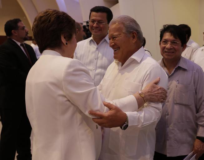 Keywords: people indoor Presidente Salvador Sánchez Cerén saluda a Victoria Marina Velasquez de Aviles, Secretaria General del SICA. Presidente Salvador Sánchez Cerén saluda a Victoria Marina Velasquez de Aviles, Secretaria General del SICA.
