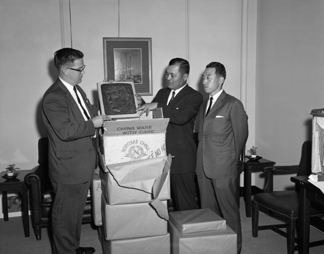 | Keywords: u.s. national archives usnationalarchives jfk presidential library jfkpresidentiallibrary blackandwhite monochrome indoor black and white Original Caption: Presidential Assistant John J. McNally with Japanese Visitors and Gifts We are looking for your help in identifying unknown people in our White House Photographs collection. If you have any information about this photograph, please post a comment, including any relevant sources, for the catalogers at the John F. Kennedy Presidential Library. Thank you! Local Identifier: JFKWHP-KN-18078 Created By: President (1961-1963 : Kennedy). Office of the Naval Aide to the President.(1961 - 1963) From: Collection JFK-WHP: White House Photographs, 12/19/1960 - 03/11/1964 Contact: John F. Kennedy Library (LP-JFK), Columbia Point Boston, MA 02125-3398 Phone: 617-514-1600 Fax: 617-514-1652 Email: kennedy.library@nara.gov Production Dates: 6/19/1961 Scope and Content Note: This is a photograph of a delivery of gifts for President John F. Kennedy. Presidential Assistant John J. “Jack” McNally (on the left) and two unidentified Japanese men and a plaque with an engraving of President Kennedy, White House, Washington, D.C. Persistent URL: JFK Library URL: www.jfklibrary.org/Asset-Viewer/Archives/JFKWHP-KN-18078.... Access Restrictions: Unrestricted Use Restrictions: Unrestricted Original Caption: Presidential Assistant John J. McNally with Japanese Visitors and Gifts We are looking for your help in identifying unknown people in our White House Photographs collection. If you have any information about this photograph, please post a comment, including any relevant sources, for the catalogers at the John F. Kennedy Presidential Library. Thank you! Local Identifier: JFKWHP-KN-18078 Created By: President (1961-1963 : Kennedy). Office of the Naval Aide to the President.(1961 - 1963) From: Collection JFK-WHP: White House Photographs, 12/19/1960 - 03/11/1964 Contact: John F. Kennedy Library (LP-JFK), Columbia Point Boston, MA 02125-3398 Phone: 617-514-1600 Fax: 617-514-1652 Email: kennedy.library@nara.gov Production Dates: 6/19/1961 Scope and Content Note: This is a photograph of a delivery of gifts for President John F. Kennedy. Presidential Assistant John J. “Jack” McNally (on the left) and two unidentified Japanese men and a plaque with an engraving of President Kennedy, White House, Washington, D.C. Persistent URL: JFK Library URL: www.jfklibrary.org/Asset-Viewer/Archives/JFKWHP-KN-18078.... Access Restrictions: Unrestricted Use Restrictions: Unrestricted |