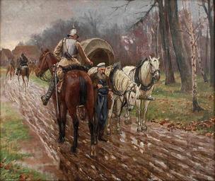 Keywords: Preussische-reiter-straße.jpg Artwork Creator Emil Hünten preußische Reiter auf der Landstraße am Planwagen in regennasser Herbstlandschaft vorm Dorf eindrückliche Schilderung des miliär Alltags partiell studienhaft-flott erfasste min pastose Malerei 1892 Oil on canvas cm 58 70 5 object history credit line http //www mehlis eu/archiv/6913/objekte/0003839 PD-art-100 Uploaded with UploadWizard Paintings by Emil Hünten |