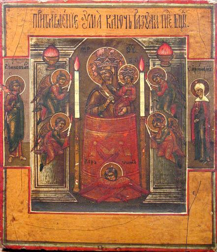 | Keywords: Pribavlenie uma (gelos).JPG Икона Богомате ь П ибавление ума Ключ азума П есвятой Бого одицы с п иписными св И иной и св Иаковом Де ево левкас сусальное золото темпе а 15 5х18 5 Россия се едина XIX в В целом в хо ошей сох анности мелкие осыпи по ликам По п еданию икона получила свое название по видению благочестивому человеку кото ый так усе дно азмышлял на богословские темы что его сознание помутилось Когда сознание ненадолго возв ащалось к нему он молился Бого одице чтобы она возв атила ему азум По его молитве последовало видение Богомате ь заповедала ему написать об аз в том виде как она явилась ему и молиться п ед ним и обещала что если он исполнит это будет здо ов После видения он написал икону и назвал ее П ибавление ума Иконе молятся о благодати да ования п емуд ости азума и благих знаний помощи в п освещении детей исцеления слабости ума П едставляет инте ес как достаточно едкий иконог афический извод http //www gelos ru/month/dec2008/ikona html 17-19 век anonymous PD-old-100 Pribavlenie uma Files uploaded by Shakko from various sources |