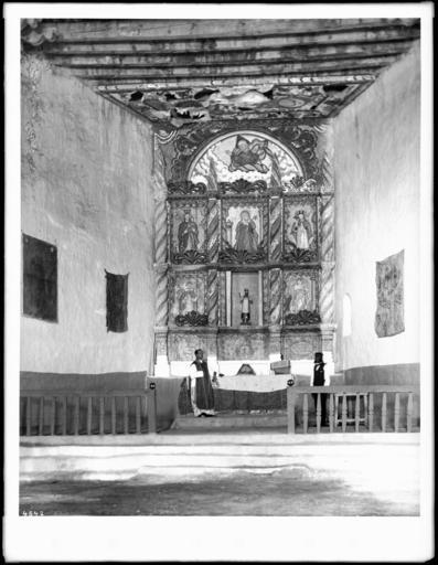 | Keywords: Priest at the altar in old church at the Acoma Pueblo, New Mexico, 1886 (CHS-4542).jpg en <br> Priest at the altar in old church at the Acoma Pueblo New Mexico 1886 Photograph of a priest at the altar in the old church at the Acoma Pueblo New Mexico 1886 The wall above the altar consists of panels containing five paintings of religious figures and a statue of a Christ in the middle Above the paintings an arch contains a depiction of a figure an angel in the clouds The table at the altar is covered with a large cloth A priest stands on the left of the altar while another man stands on the right The rails of the altar can be seen in front of the altar Four steps lead up to the altar while three paintings or hangings are visible on the side walls The ceiling is ornately decorated Call number CHS-4542 Legacy record ID chs-m16877; USC-1-1-1-13461 Photographer James George Wharton Filename CHS-4542 Coverage date 1886 Part of collection California Historical Society Collection 1860-1960 Type images Geographic subject city or populated place Acoma Pueblo Repository name USC Libraries Special Collections Accession number 4542 Microfiche number 1-160-42 Archival file chs_Volume96/CHS-4542 tiff Part of subcollection Title Insurance and Trust and C C Pierce Photography Collection 1860-1960 Repository address Doheny Memorial Library Los Angeles CA 90089-0189 Geographic subject country USA Format aacr2 2 photographs glass photonegative photoprint b w ; 22 x 17 cm Rights Digitally reproduced by the USC Digital Library; From the California Historical Society Collection at the University of Southern California Subject adlf religious facilities Project USC Repository email specol usc edu Identifying number unidentified no James-1370 Contributing entity California Historical Society Date created 1886 Publisher of the digital version University of Southern California Libraries Format aat photographic prints; photographs Geographic subject state New Mexico Format glass plate negatives Access conditions Send requests to address or e-mail given Phone 213 821-2366; fax 213 740-2343 Subject file heading Indians -- Acoma Subject lcsh Indians of North America; Acoma Indians Subject Acoma Indians; Acoma; Interiors 1886 date created George Wharton James 1858 1923 http //digitallibrary usc edu/cdm/ref/collection/p15799coll65/id/16799 PD-old-70-1923 Saint Stephen of Hungary church in Acoma Pueblo ˘ Interiors of churches in New Mexico Acoma New Mexico in the 1880s Acoma Images from USC Digital Library uploaded by Fæ Photographs by George Wharton James California Historical Society Collection 1860-1960 Glass plate negatives Acoma Pueblo Statues of Stephen I of Hungary 1880s photographs |