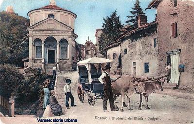 Keywords: Versione colorata. A sinistra la chiesa dell'Immacolata Concezione (1609) sullo sfondo l'Arco del Rosario (1607) da cui si diparte la Via Sacra: entrambe sono opera dell'architetto Giuseppe Bernasconi. A destra la cascina Morona e a seguire l'albergo Riposo. varese primacappella |