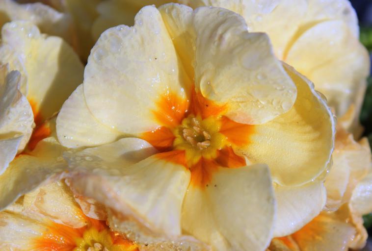 Keywords: primroses primula primrose flowers plant close spring yellow raindrop