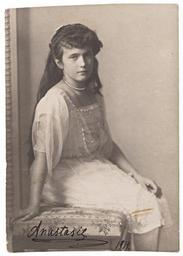 | Keywords: Princess Anastasia Nikolaevna 1914 portrait.jpg Princess Anastasia Nikolaevna of Russia with signature Anastasie 1914 8 9 x 12 6 cm From the estate of her nanny žShura http //www bassenge com Galerie Bassenge 1914 Boissonnas et Eggler St Petersburg Nevsky 24 <gallery> Grand Duchess Anastasia Nikolaevna jpg Unrestored Grand Duchess Anastasia Nikolaevna Crisco edit jpg Restored with original identification Grand Duchess Anastasia Nikolaevna Crisco edit letters removed jpg Restored without original identification Grand Duchess Anastasia Nikolaevna Crisco edit crop jpg Restored with crop </gallery> PD-RusEmpire PD-1923 Anastasia Nikolaevna of Russia in photographs 1914 Images from Galerie Bassenge 1914 portrait photographs F 20th-century black and white portrait photographs of sitting women at three-quarter length 1914 Boasson and Eggler |