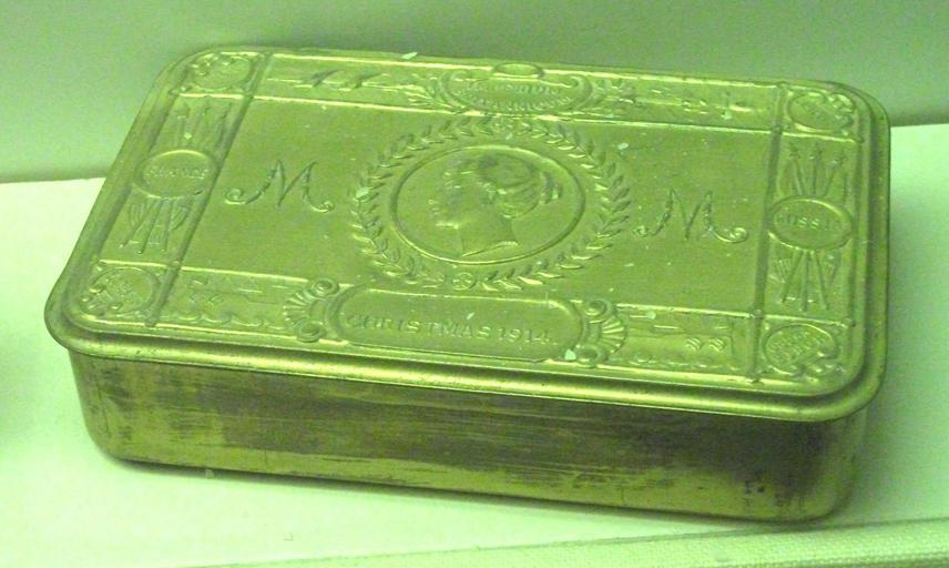 Keywords: PrincessMaryWW1CigsChoc.JPG en A box originally containing chocolates and cigarettes given by Princess Mary to all servicemen in France for Christmas 1914 fighting World War 1 The words on the box are IMPERIUM BRITANNICUM at the top CHRISTMAS 1914 at the bottom FRANCE on the left and RUSSIA on the right The box was designed by architects Stanley Davenport Adshead and Stanley Churchill Ramsey own Simon Speed 2010-09-28 Work of artistic craftsmanship on permanent display in a public place Bedford Museum Bedford Photos by Simon Speed Christmas 1914 Mary Princess Royal and Countess of Harewood Chocolate boxes |