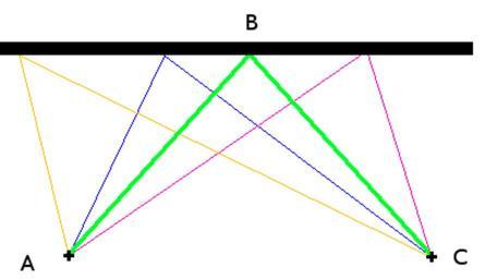 Keywords: Principe du plus court chemin.png droite est obtenu lorsque l'angle d'incidence est égal à l'angle réfléchi sur la figure il s'agit du chemin vert own PerOX 2009-01 Reflection diagrams Calculus of variations