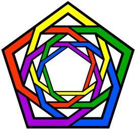 Keywords: Principia Discordia page00043 mandala (Brunnian link).svg A rendering of the mandala design or knot-theoretic link found on page 00043 of Principia Discordia This is made of five interlaced irregular nonagons fitted within an overall pentagon No two nonagons are directly interlinked but any three adjacent nonagons for example yellow green and blue are in a Borromean rings configuration For a presumably topologically-equivalent structure which may be easier to understand visually see Image Five-interlaced-pentagons svg For other examples of linked structures which contain multiple Borromean rings configurations see Image Borromean-cross png and Image Borromean-chainmail-tile svg The text on page 00043 of Principia Discordia reads MANDALA No two elements interlock but all five do interlock This version of the design was taken from a character outline in the PostScript Type 1 Fnord Hodge-Podge Discordian fonts version 2 by toa267 declared by him to be Public Domain with illustrative coloring for clarity applied by User AnonMoos Additionally the original material in the Principia Discordia was also declared to be Kopylefted or public domain -- All rites reversed etc 2009 SVG AnonMoos SVG Decorative knots Discordianism Borromean rings Color permutation of order 5 Blue green purple red yellow 5-fold rotational symmetry Knots and links on transparent background 5 component links Outline knots and links |